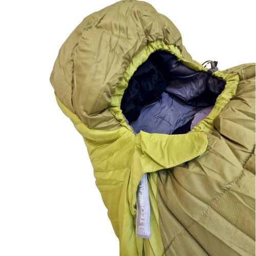 Øverst har soveposen en bredde på 0,8 m og nederst en bredde på 0,5 m. Dette sikrer en behagelig passform som raskt varmer opp luften rundt deg, men likevel gir god bevegelsesfrihet. Cinamon holder varmen komfortabelt ned til 2°C, og tatt til det ekstreme ned til -3°C. Den integrerte hetten sørger for at du ikke fryser på hodet, mens halskraven er myk og behagelig, og gjør at varmluft ikke slipper ut av posen.