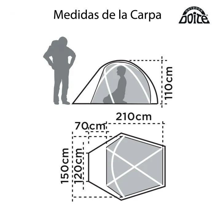 Selv i et såpass kompakt telt er det ingen fare for å være i veien for hverandre, siden det er inngang både foran og bak. Det er også et ventilasjonsuttak som sikrer optimal luftsirkulasjon, slik at du kan nyte frisk luft og opprettholde en behagelig atmosfære. Tolima er satt sammen med 3 stenger av aluminiumslegeringen duraluminium slik at det er solid og gjør det enkelt å montere.