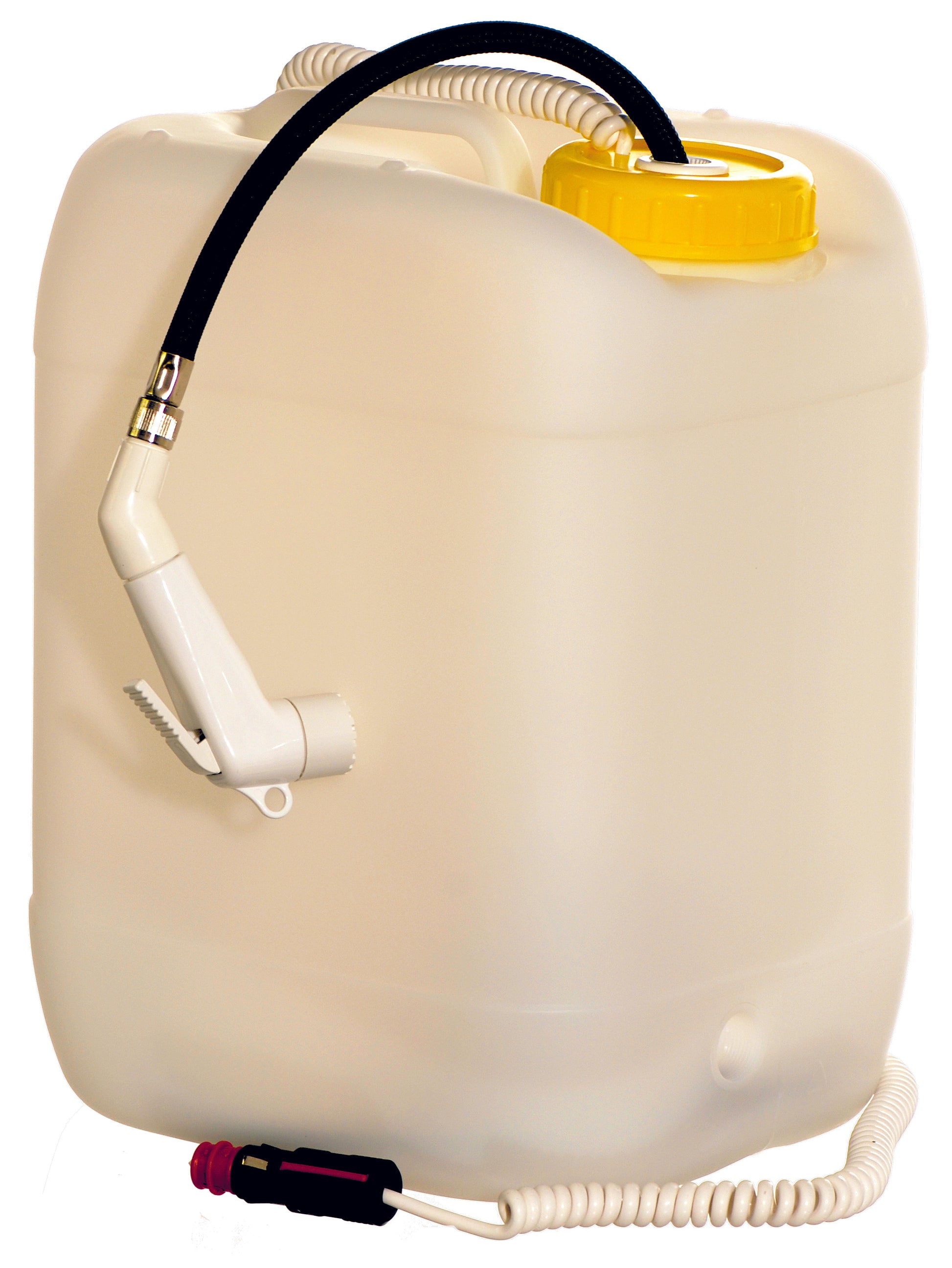 Bærbar dusj med kanne og synkepumpe med kapasitet på 12l/min. Dusjslangen er 2m og dusjgrepet har et stoppgrep så man kan justere vannet slik man ønsker.