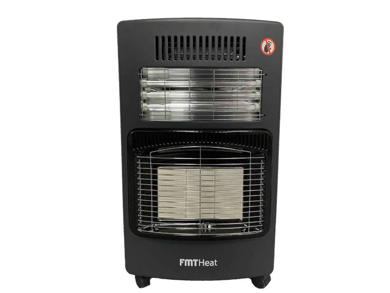 FMT Heat Gass, infrarød varmeovn og vifte med varmevifte. Denne gassvarmeren har plass til en gassflaske og er på hjul slik at den enkelt kan flyttes rundt.