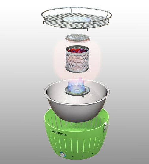Den utvendige bollen til LotusGrill er laget av pulverlakkert stål og blir ikke varm som andre griller. Du kan til og med flytte på grillen under bruk! En annen stor fordel med LotusGrill er at fettet fra maten drypper ned i den indre bollen. På den måten unngår man at fettet drypper ned i kullet og skaper ild, røyk og mulig utvikling av helseskadelige stoffer.
