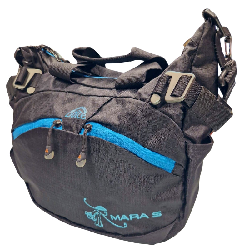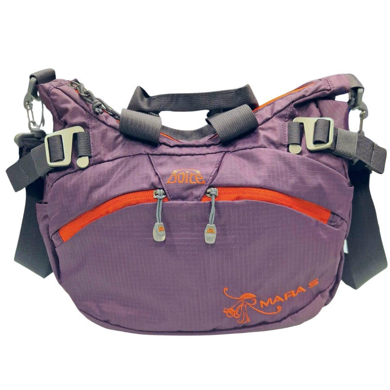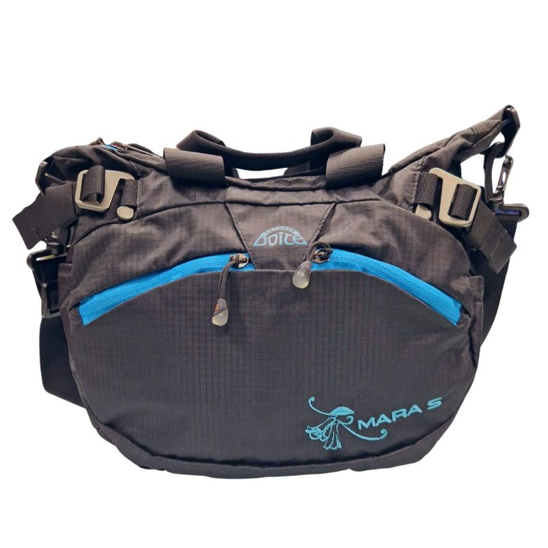 På utsiden er det tre lommer for rask tilgang, to foran og en bak. Den har også to flaskeholdere på sidene, og om en skulle ønske å bære vesken i håndtaket, er skulderreimen avtagbar. Mara er laget av 50% nylon og 50% polyester, og er svært enkel å tørke av med en fuktig klut, skulle den bli skitten