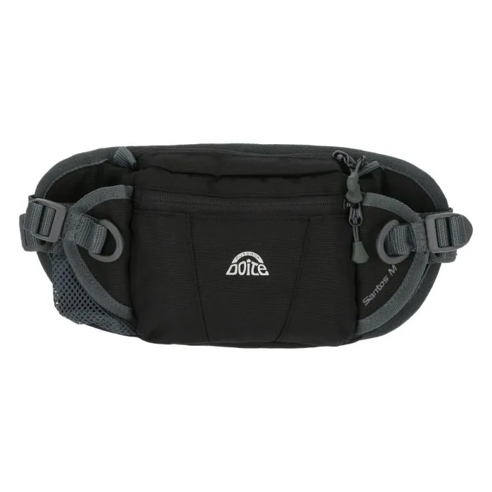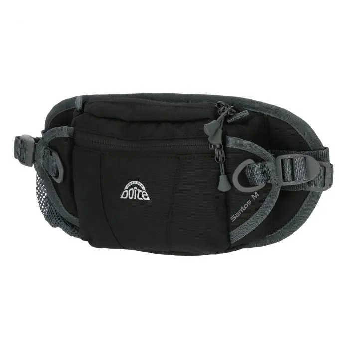 Santos M er en rumpetaske med et romslig hovedrom som har tre ekstra lommer for organisering. En av disse lommene er spesiallaget for mobiltelefonen takket være trikotstoffet som forhindrer riper. Utenfor hovedrommet er det også en ekstra lomme for rask tilgang, i tillegg til to flaskeholdere, hvor en av dem har netting under for ytterligere støtte. Inn mot hoften er det en sikkerhetslomme som passer fint til bankkort, sedler og pass.